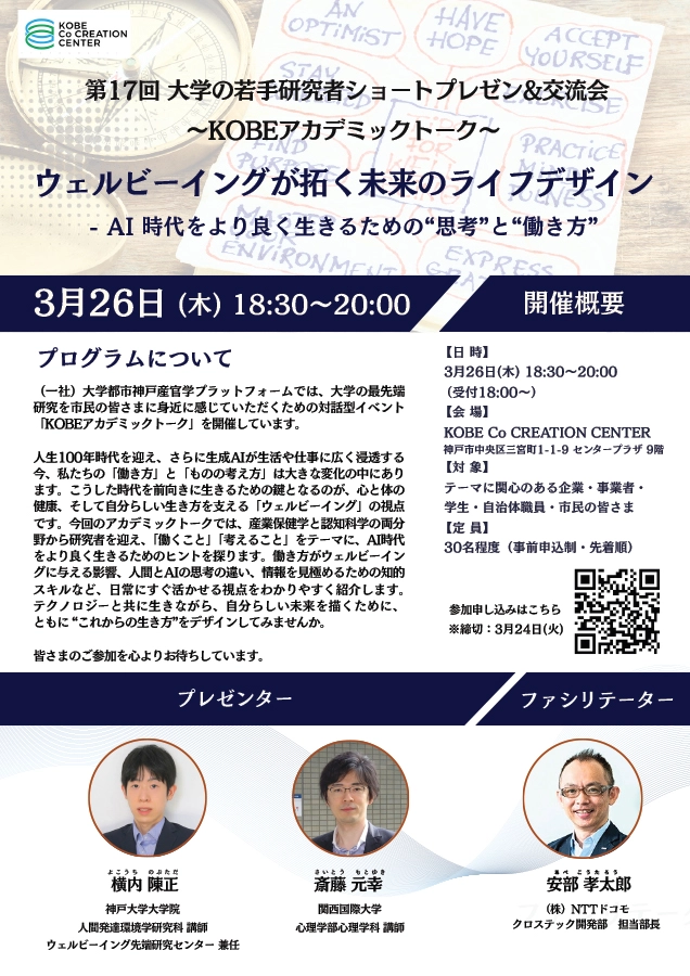 人生100年時代を迎え、さらに生成AIが生活や仕事に広く浸透する今、私たちの「働き方」と「ものの考え方」は大きな変化の中にあります。こうした時代を前向きに生きるための鍵となるのが、心と体の健康、そして自分らしい生き方を支える「ウェルビーイング」の視点です。今回のアカデミックトークでは、産業保健学と認知科学の両分野から研究者を迎え、「働くこと」「考えること」をテーマに、AI時代をより良く生きるためのヒントを探ります。働き方がウェルビーイングに与える影響、人間とAIの思考の違い、情報を見極めるための知的スキルなど、日常にすぐ活かせる視点をわかりやすく紹介します。テクノロジーと共に生きながら、自分らしい未来を描くために、ともに“これからの生き方”をデザインしてみませんか。皆さまのご参加を心よりお待ちしています。